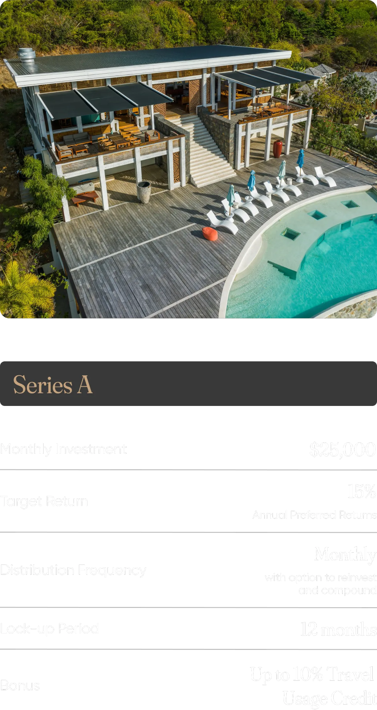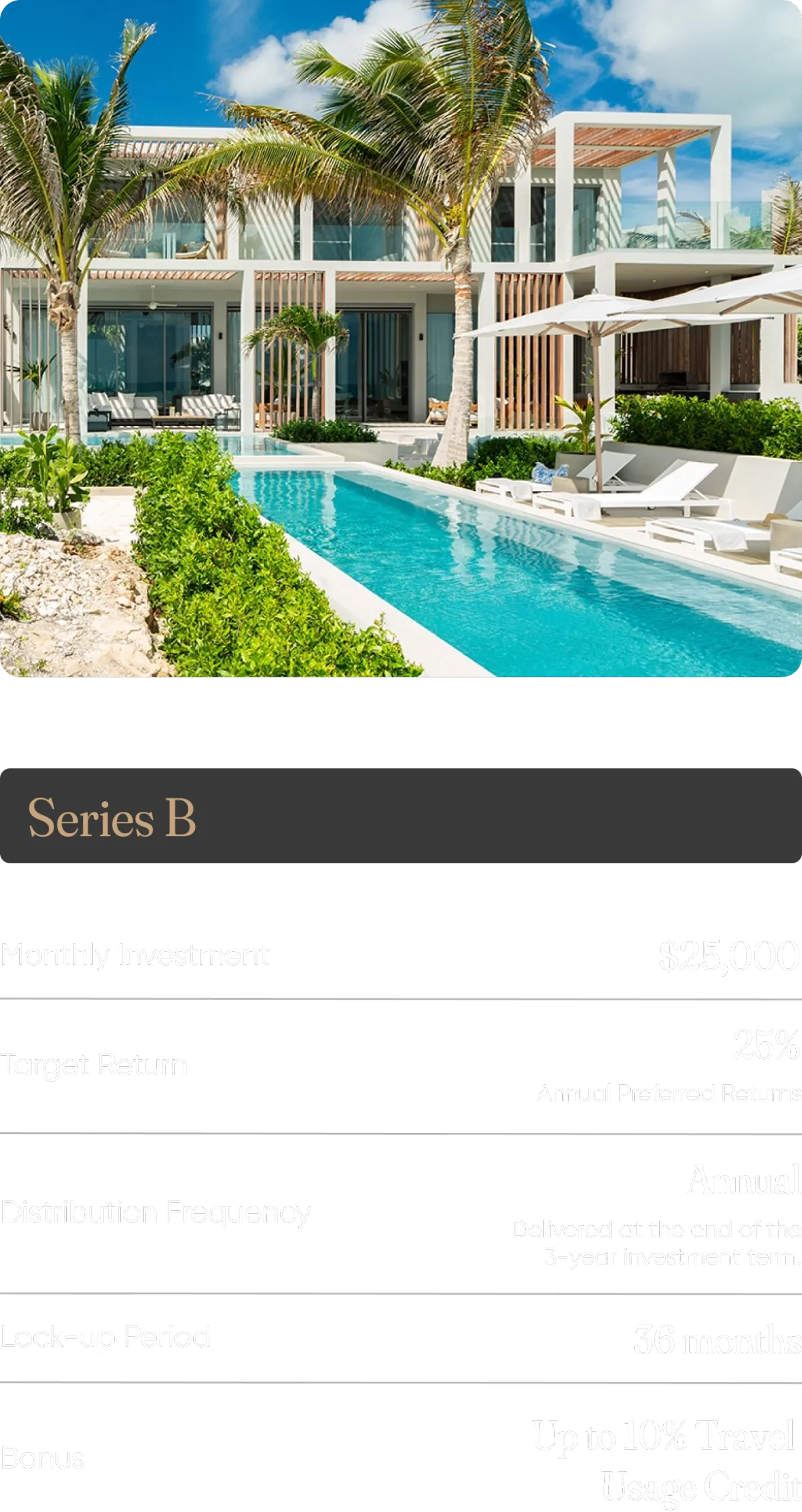Signature Capital's Series A offers investors the potential for consistent monthly distributions from our portfolio of luxury hospitality properties. This allows you to benefit from the income generated by high-end rentals in premier destinations.